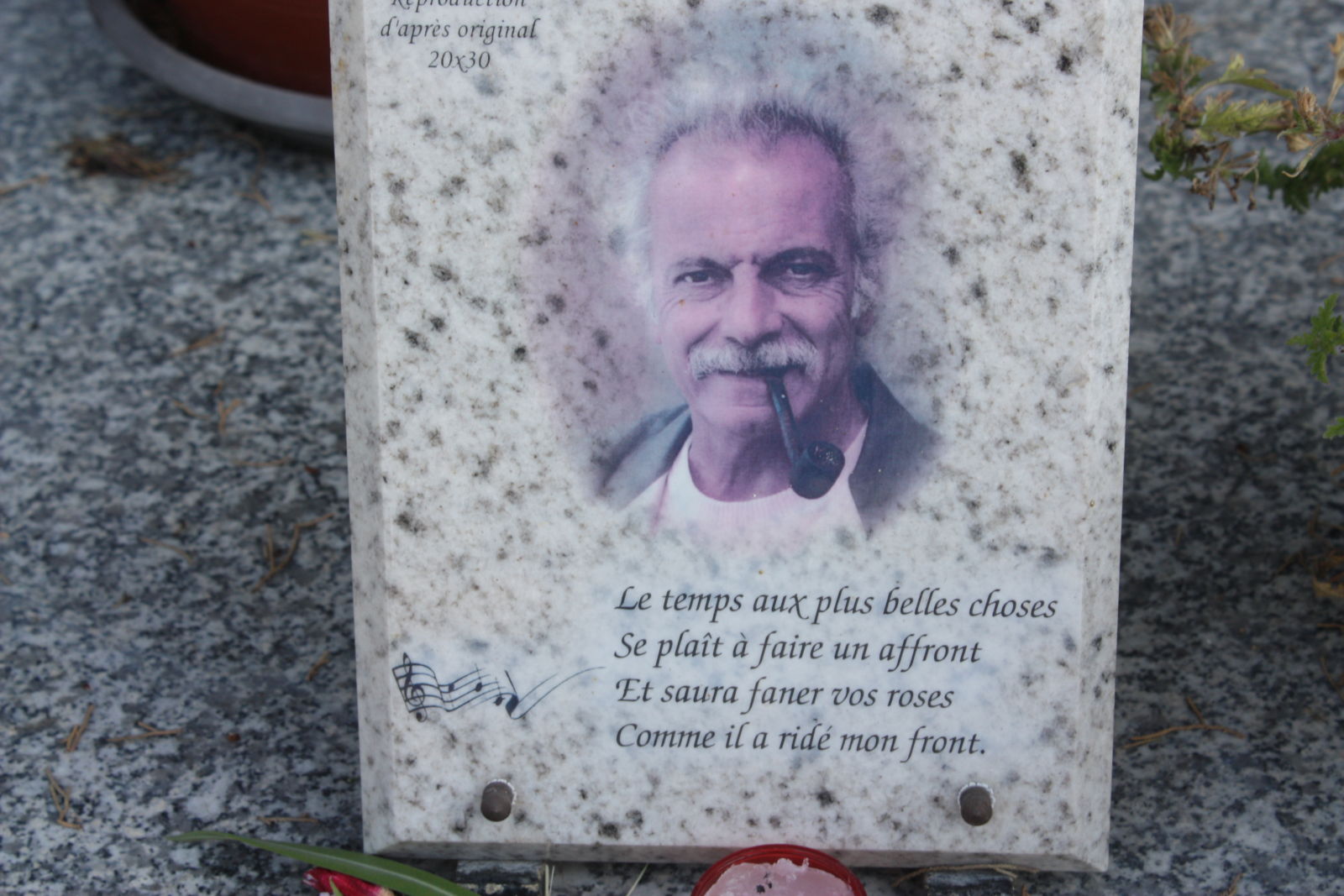 Au dessus, l’attirail de la légende, la pipe la moustache, le cheveu frisé, l’œil noir et bon. Brassens. Modeste jusque sur sa tombe, l’homme a choisi des vers de Pierre Corneille qu’il avait mis en musique. Pas quelques uns de ses mots, lui l’orfèvre de la belle langue française, lui qui savait mieux que nul autre ciseler un vers au rythme du mot juste qu’il bardait de poésie, de cocasserie, d’humour. Il aurait pu demander qu’on y apposât deux trois vers de l’un de ses chef d’oeuvres sur sa tombe, quand il réclamait justement sa sépulture sur la plage de Sète, y être acheminé « dans un sleeping du Paris-Méditerranée », « passer sa mort en vacances” avec ces belles ondines dont l’ombre s’y couche un peu dessus…
