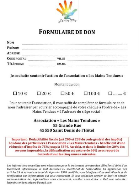 Les dons des particuliers à l’association « Les Mains Tendues » bénéficient d’une réduction d’impôts de 75% jusqu’à 537€. Au-delà, et dans la limite des 20% des revenus imposables, la défiscalisation est encore de 66%.