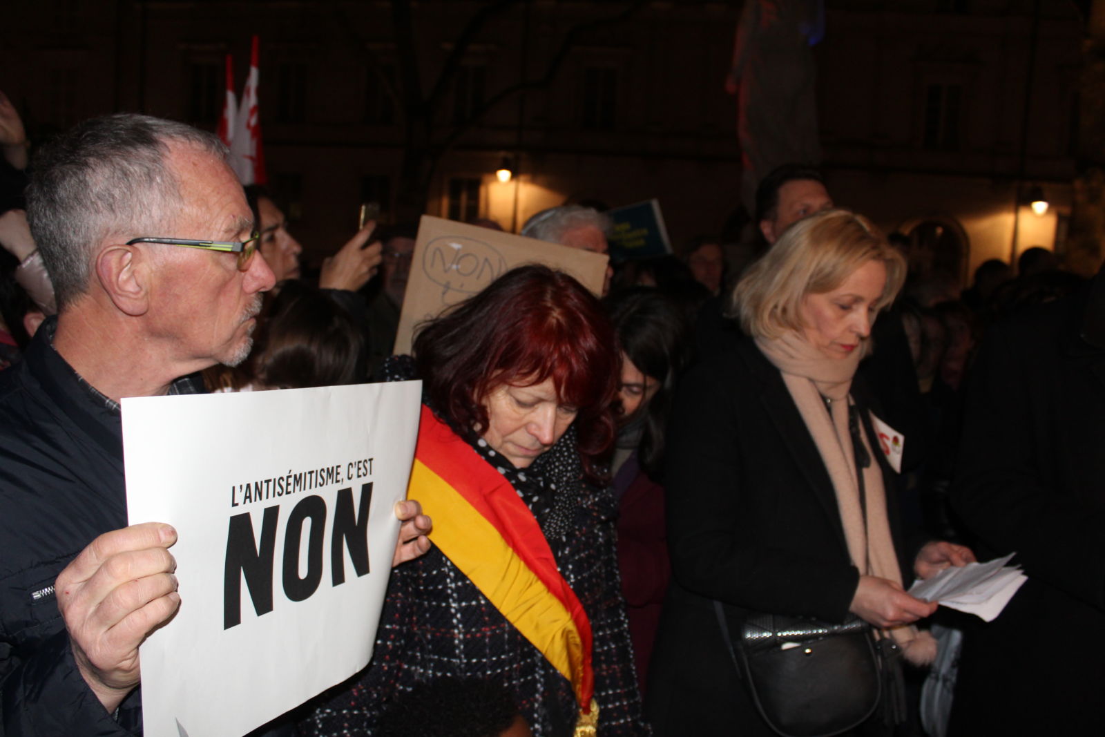 Pour clore la cérémonie, une salve d’applaudissements pour se faire entendre, un “ça suffit” scandé, puis une Marseillaise ont été repris en chœur par les manifestants dont on aura pu noter une fois de plus l’âge avancé. L’antisémitisme ne concernerait-il pas les jeunes ou la méthode employée est-elle inapte à les mobiliser? Ce constat, lui non plus, ne doit pas laisser  indifférent.