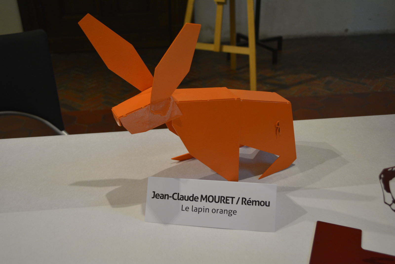 Jean-Claude Mouret, sculpteur sur fer, propose un lapin orange en tôle peinte qui fera office de pièce de gibier et de trophée.
