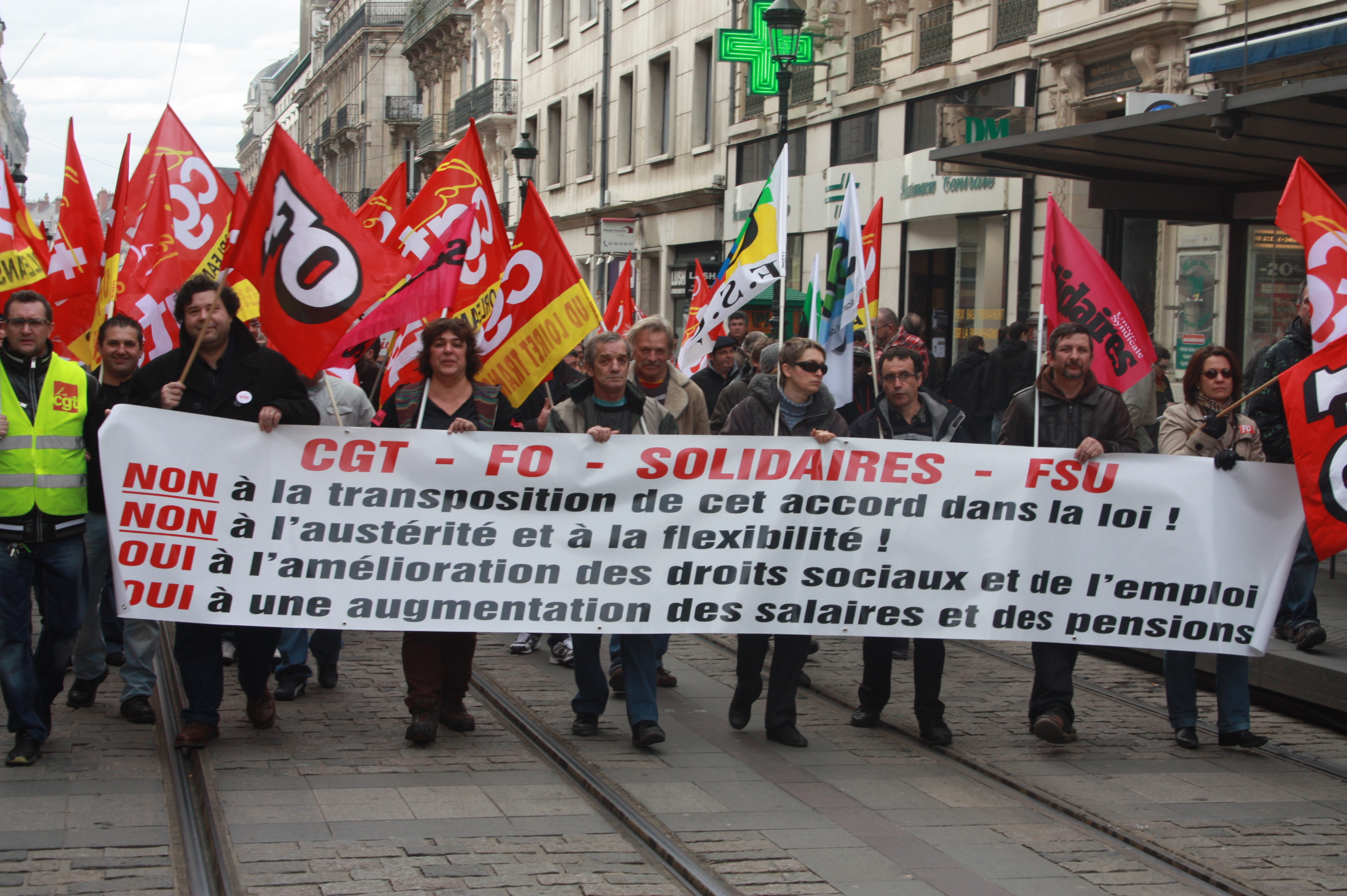 IMG_1710L’état de grâce est bel et bien enterré à gauche. Il avait déjà pris quelques coups de canifs depuis l’été. Cette fois avec, entre 1 300 et 1 500 manifestants hier dans les rues d’Orléans, contre “l’accord sur la sécurisation de l’emploi”, le bras de fer est engagé entre le gouvernement et la CGT, FO, FSU et Solidaire, les syndicats organisateurs. Pour les manifestants,  l’ANI (Accord national interprofessionnel) signifie une attaque sans précédent contre le code du travail.