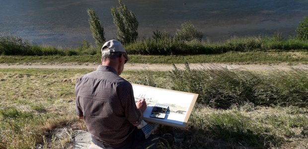 En ce temps de Pentecôte ensoleillé, les bords de Loire attirent les promeneurs et les pêcheurs d’images. Ainsi, dimanche, ce peintre se trouve-t-il paisiblement installé sur la berge du quai de Prague d’Orléans pour réaliser une talentueuse aquarelle représentant le pont George V ainsi qu’un peu de ville que domine la cathédrale Sainte-Croix. Voici, ce que confirme un regard discrètement jeté par-dessus l’épaule de l’artiste, l’art de s’en mettre joliment comme passionnément plein la vue. Plein la vie.