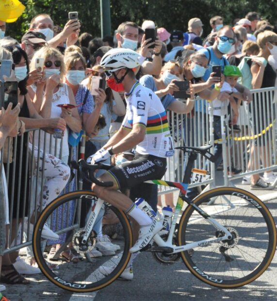 Le fléchage et le panneautage sont moindres. Juste la direction « Départ » en noir sur couleur rouge. À l’approche de la fameuse ligne, ce sont les bénévoles qui gèrent. Et plutôt bien… On retrouve une nouvelle brigade de jeunots en noir et jaune, toujours amènes. On retrouve de nouveaux treillis et polos noir, toujours directifs mais moins impérieux. On retrouve les coureurs, cette fois au ralenti. On découvre le podium, ses animations, ses coups de pubs, sa présentation des équipes. On voit les bus des teams, les vélos accrochés à des portants juste devant. On interpelle le champion du Monde, Julian Alaphilippe, qui vient de s’arrêter dire bonjour à des amis, arrivés de bonne heure spécialement pour le saint-Amandois. Un petit signe. Les yeux quasi rieurs par-dessus le masque en disent long sur la satisfaction d’être en territoire de connaissance. Un café gratuit auprès du village départ, pour tout le monde, quelques viennoiseries aussi. C’est la caravane qui redémarre, avec son ballet de véhicules et de haut-parleurs. Le défilé est plus compact. La foule aussi.