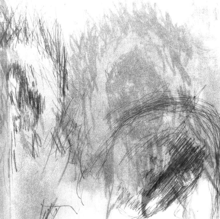 On entre ici très vite dans le vif du sujet , des visages, des personnages apparaissent en filigrane sur les feuilles de dessin, paradoxalement Delphine Loiseau nous tient à l’écart à distance, mais est-ce vraiment nous qu’elle éloigne ? que suggère-t-elle? peut-être une impossibilité à rejoindre ces apparitions ? comme si ces êtres presque advenus se retiraient hors champs, ou bien ont-ils décidé de déjouer nos plans, de s’émanciper à notre insu ? ou bien encore est-ce la matière, le papier, la mine de plomb, la pierre noire qui s’arrangent à leur façon, brouillant les pistes ? voici ce qu’elle en pense, Delphine Loiseau : “… La représentation devient le lieu de l’interrogation des visages, matrice de de ce qui se joue, socialement et intimement. Lieu d’une contorsion sourde, marge insondable sous-jacente, qui persévère au point d’en faire courber l’échine du support. Le papier se plie à ces inévitables manières… Le support en est victimisé… Déformation ou formation de figures latentes, comme une image argentique en révélation…Le dessin comme le lieu d’une expression à dessein, mais aussi, et de manière ambivalente comme ce terrain mouvant, élastique et empirique qui n’affirme pas, mais au contraire se laisse faire et avoir par ce qu’il révèle, pour apparaître peu à peu autonome et, ainsi, finir par suggérer ses propres grimaces… ”