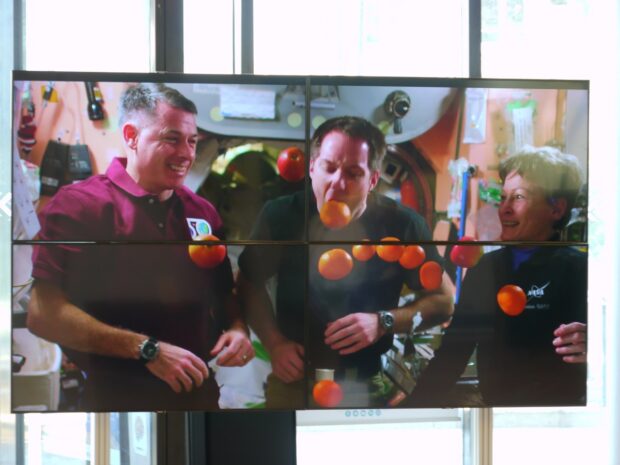 Des écrans projettent en continu des vidéos de l’ISS. Photo Elodie Cerqueira