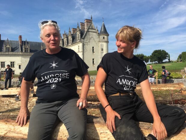 Sur les terrasses du château d’Amboise, face Loire, au pied de la chapelle Saint Hubert, des coups de haches s’abattent sur des grumes de chênes en bois vert dans une ambiance apaisante où seul résonne le bruit du tranchant et de la scie sur le bois… Ici pas de machines, mais un chantier manuel avec « des techniques ancestrales déjà utilisées au Moyen-Age et reproduites sur la tapisserie de Bayeux », indique François Calame, fondateur de l’association « Charpentiers sans Frontière ». Au cœur de l’exercice, 30 charpentiers et charpentières professionnels volontaires de 17 à 60 ans et de 8 nationalités différentes (américaine, allemande, anglaise, française…) qui se portent au chevet d’un monument historique fatigué : l’emblématique chapelle des rois, connue pour abriter la sépulture de Léonard de Vinci.