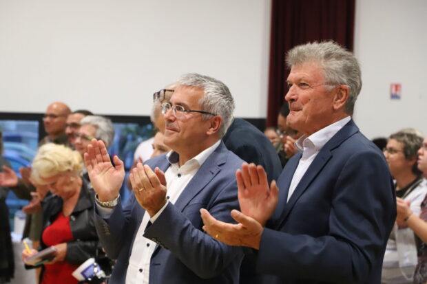 Bernard Thévenet (à droite) est le parrain de Telmah avec Marie-Amélie Le Fur, présidente du Comité paralympique français. Photo Jean-Luc Vezon