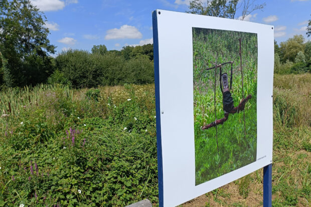 A Sargé sur Braye, les oeuvres d’Hans Silvester auraient du être dans le parc de la mairie, comme celles d’Eric Zeziola pour la 17e édition des Promenades photographiques. Mais la sécheresse du sol n’a pas permis d’implanter les structures adéquates, et c’est dans un lieu beaucoup plus sauvage qu’elles ont élu domicile, sur la promenade menant à la base de loisirs, ce qui leur va aussi bien. Les habitants et visiteurs, jouant les promeneurs, peuvent donc admirer des images d’épouvantails, après avoir appréciés d’autres clichés et quelques spécimens dans les rues de la ville. Pourquoi ce choix, cette thématique voulue par l’artiste ?