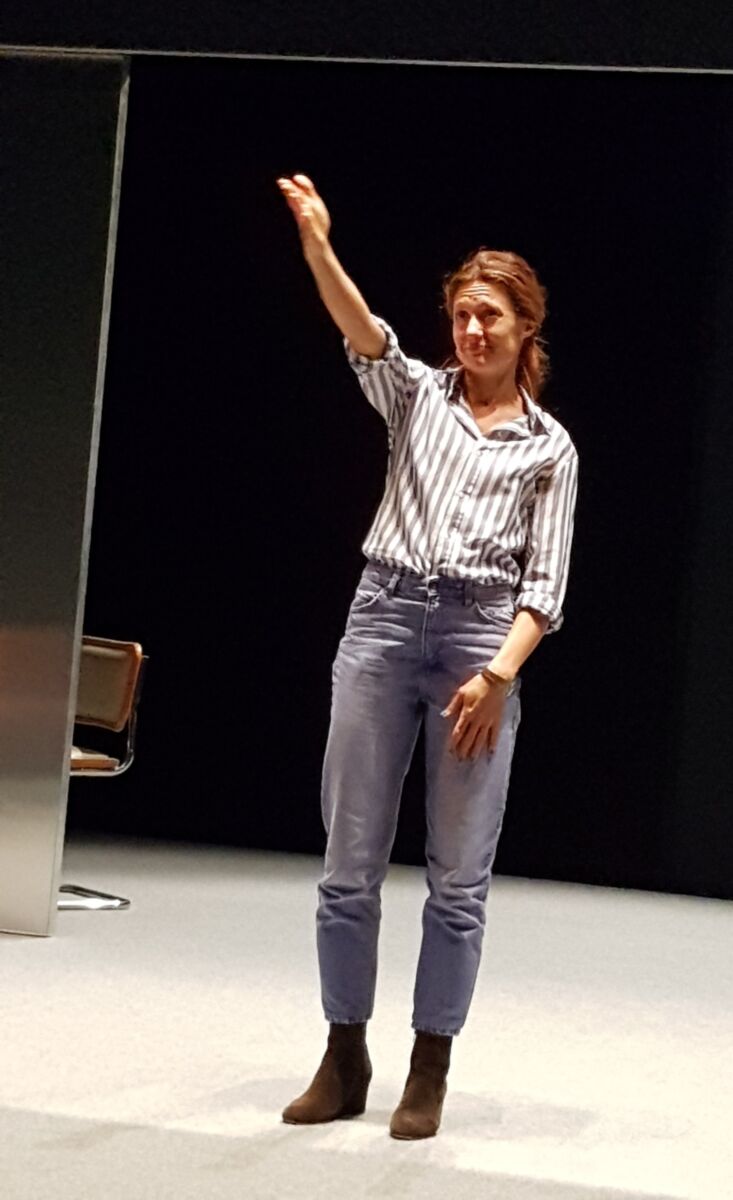 Sur le plateau, quatre sièges à gauche et des panneaux coulissants au fond que l’actrice, seule en scène, déplacera faisant par moments apparaître une entrée d’appartement, table basse et chaise. Elle, c’est Bénédicte Cerutti qu’on avait vue dans un Soli du CDN, il y a deux ans. Grande, mince, jean et maillot qu’elle recouvrira plus tard d’une chemise à rayures, elle nous livre ce texte, plein d’humour au début, racontant la vie sexuelle de cette femme, tombant amoureuse d’un homme dans une file d’attente d’un aéroport, le couple aura deux enfants, puis la monotonie s’installe, la femme veut divorcer, et c’est là que le drame survient, celui qu’on peut lire dans les faits qu’on qualifie de divers, drame épouvantable, incompréhensible. Sa voix s’affaiblit peu à peu, chuchotements parfois presque inaudibles, seuls quelques mots nous permettent de suivre, tant l’émotion la submerge. Puis, elle reprend force, parce qu’il faut bien vivre après.