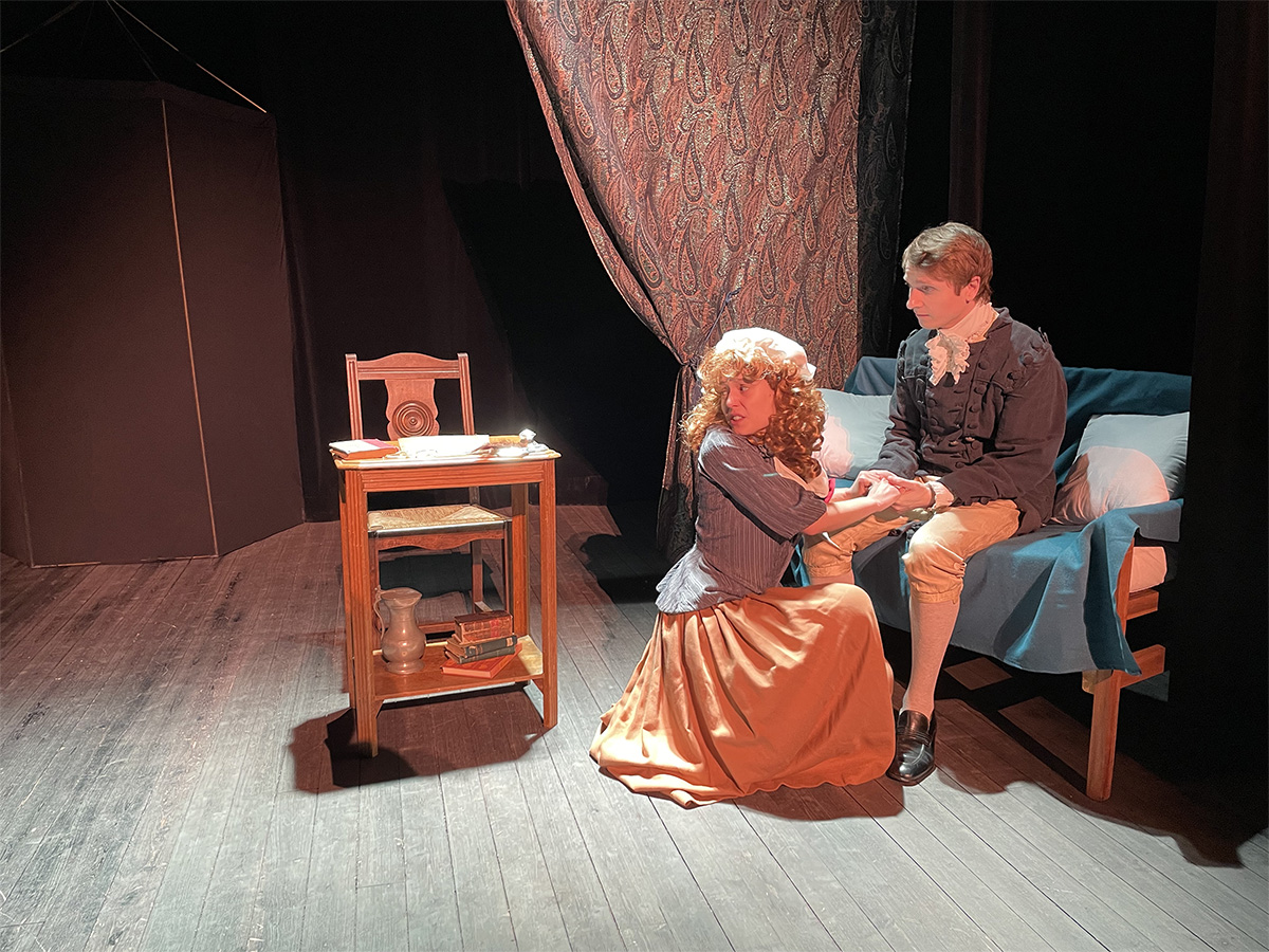Sur le plateau, à droite, le cabinet de travail de « l’incorruptible », une chaise, un bureau, un divan. A gauche, le salon d’Olympe, deux fauteuils devant un paravent. Adrien Deschamps campe un Robespierre jeune, hésitant, mais travailleur, tombant malade, très éloigné des images de boucher que certains lui prêtent, entouré de sa sœur Charlotte et de son amie qui semble le couver, Eléonore Duplay, deux rôles interprétés par une pétillante Isabelle Couloigner. L’autrice et metteuse en scène, Sandrine Gauvin est une Olympe de Gouges volontaire, ne reculant devant rien afin de faire avancer la cause des femmes, prête à défier le Comité de Salut Public. Elle aime aussi échanger avec son amie, Sophie de Condorcet (Manon Simier, exquise marquise !), au sein de son salon.