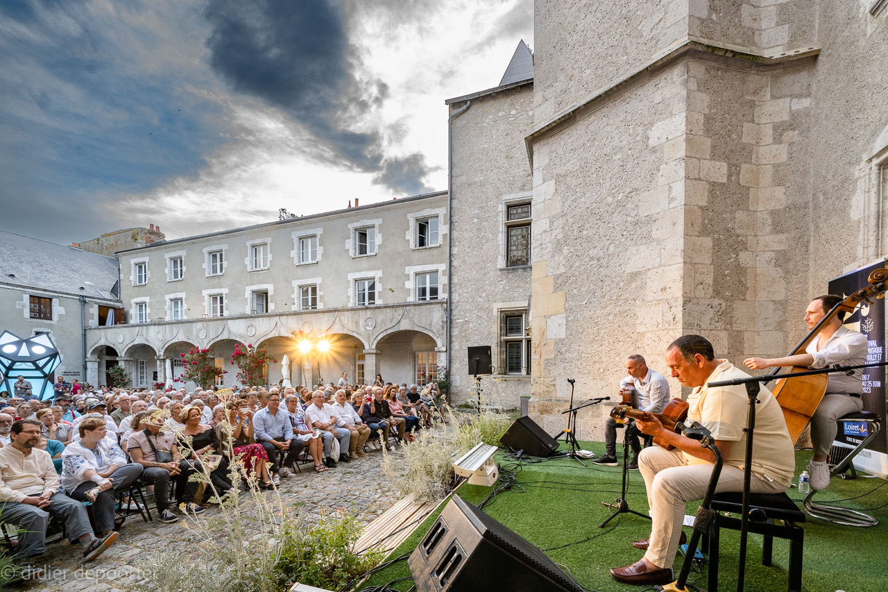 Stochelo Rosenberg trio était le troisième concert du Festival de musique de Sully et du Loiret 2023 qui, cette année, fête son cinquantième anniversaire. C’est dans ce cadre que le château de Beaugency réservait, pour la deuxième fois, sa scène à une formation de jazz. L’an dernier, Paul Lay trio avait inauguré de belle manière ce partenariat.