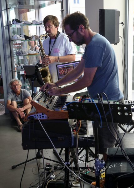 Installés dans un magasin, le Renouveau, rue Charles Sanglier, Baptiste Dubreuil, cerné par des machines à boutons, potentiomètres et claviers, et David Sevestre ont proposé des impros tout de même très préparées. Un premier morceau nous a emmené dans des atmosphères planantes, plus électrique que musique d’instrument. Des boucles de rythmes et quelques bribes de mélodie changeaient la couleur, passaient de mer en montagne, mais la promenade restait très calme. Un deuxième morceau, des variations autour de Naïma, le thème de Coltrane, proposait une musique plus humaine, le souffle de David et les doigts de Baptiste dialoguaient dans des développements intéressants et prenants. D’ailleurs ils ont repris un autre thème de Coltrane et David a fait chauffer son saxo, amenant de l’émotion dans cette musique un peu froide du Moog et du Rhodes. Alors qu’on le sait, Baptiste sur un piano peut émouvoir profondément. Musique de recherche, belle expérience pour tout le monde, les passants étonnés, les commerçants ravis et le public très proche des musiciens.