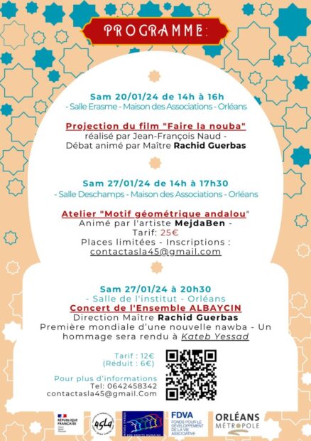 L’ASLA (Association de Solidarité Loiret Algérie) organise du 20 au 27 janvier les “Journées Andalouses Orléanaises”. Ces Journées Andalouses Orléanaises se termineront par le concert de l’ensemble ALBAYCIN de musique arabo-andalouse dirigé par Maître Rachid Guerbas le 27 janvier à partir de 20h30 salle de l’Institut à Orléans.