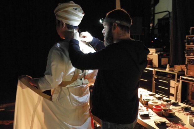 Les lieux sont trop petits pour accueillir ceux que l’on oscille à appeler artisans ou magiciens du spectacle, et une tente est érigée pour servir de loges complémentaires. Les choristes y grouillent, chauffent, s’habillent, échangent, révisent, fredonnent… La bonne humeur est de mise et les jeunes s’activent autour des artistes. C’est l’heure de l’habillage, coiffure, maquillage, et les lycéens, très professionnels, s’acquittent à merveille de leurs différentes tâches.