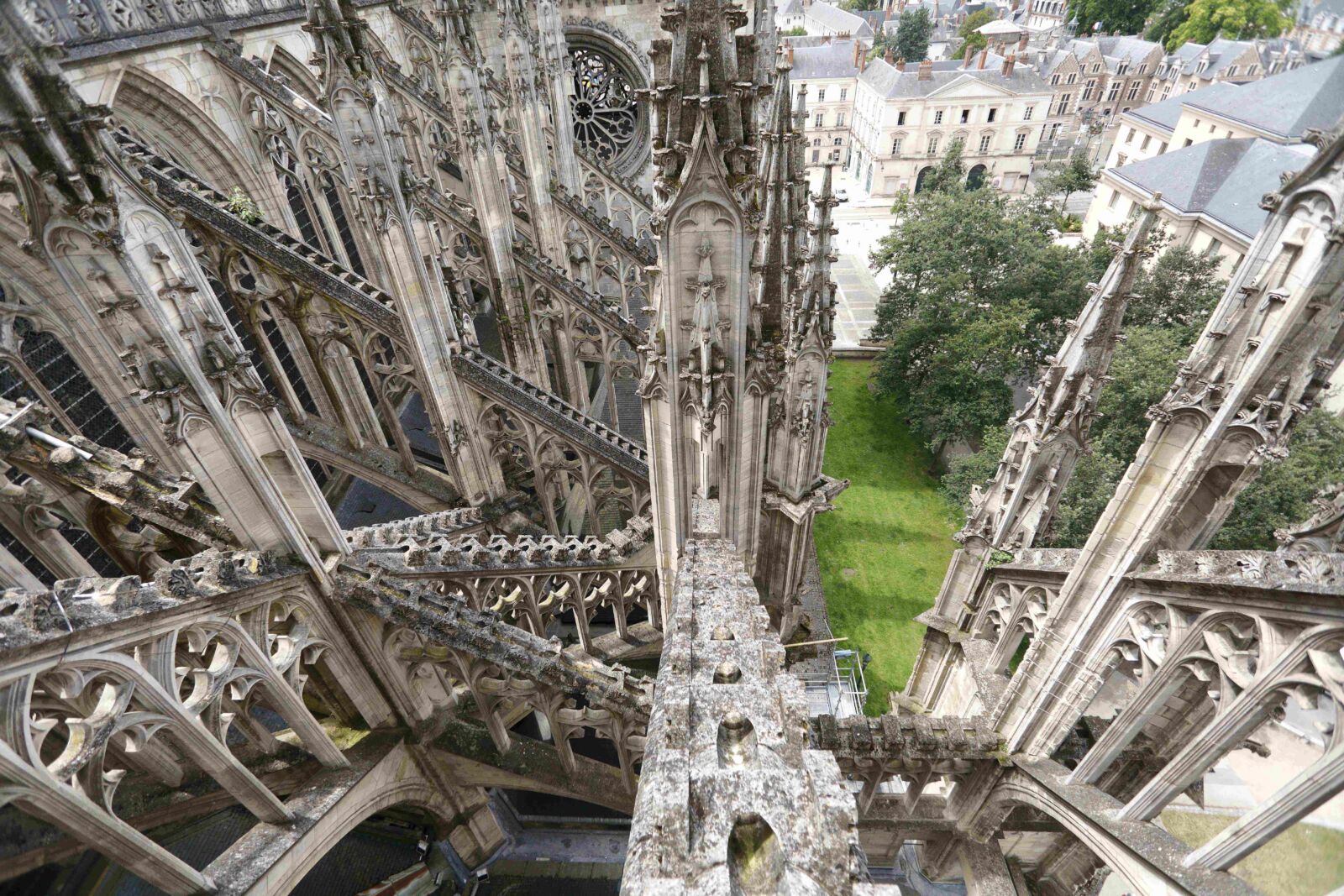 C’est ainsi que 240 marches plus tard… et plus haut, notre petit groupe longe par l’extérieur les grands combles en empruntant les chenaux – ceux-là même qui permettent aux eaux pluviales d’être évacuées vers les gargouilles. Sous nos yeux, la forêt d’arcs-boutants poursuit sa mission : maintenir la cathédrale gothique debout.