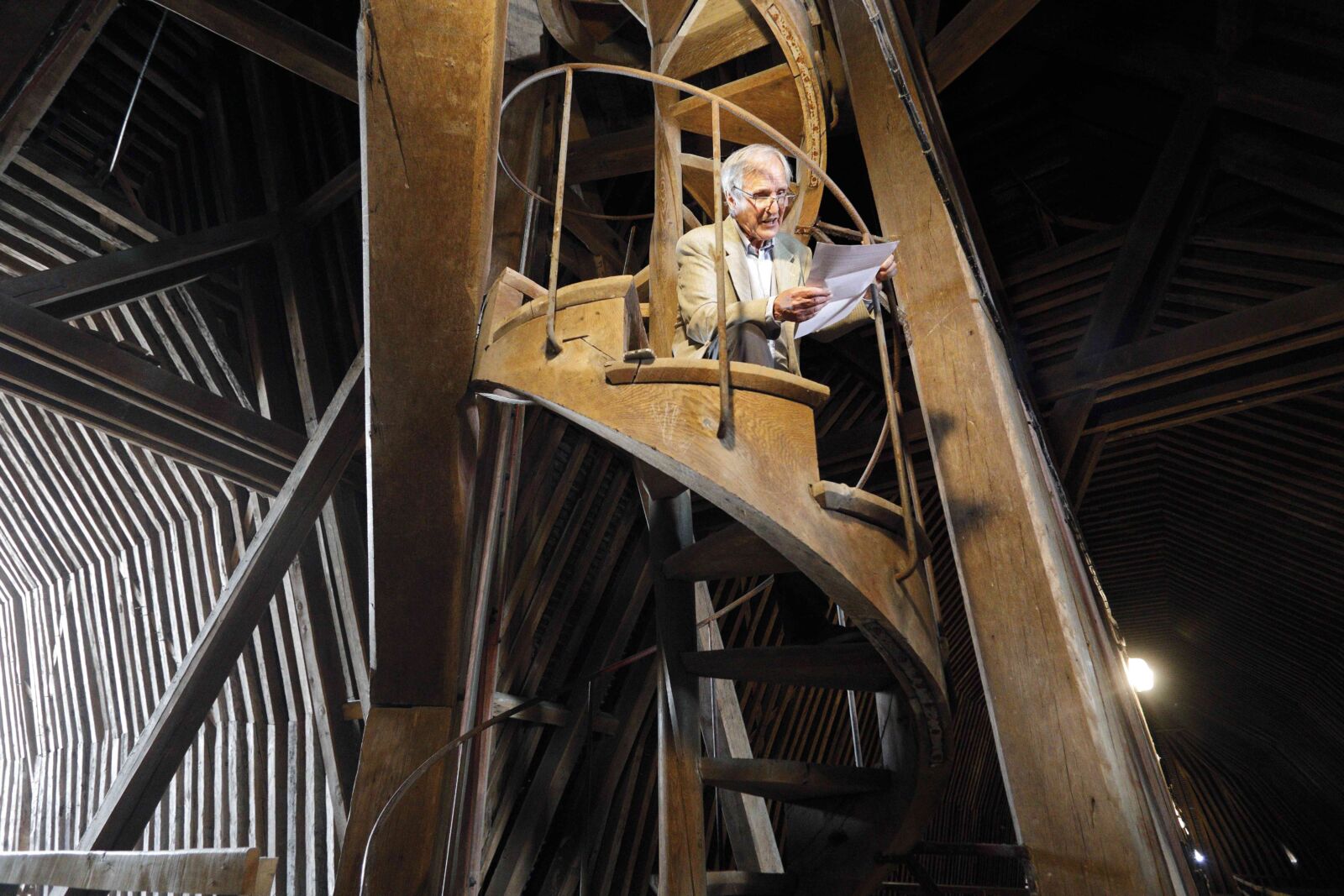 C’est le moment que choisit Bernard Brangé pour lire son hommage. Il s’installe pour cela non pas dans une chaire mais à quelques marches au-dessus de l’assistance sur le remarquable escalier à vis réalisé par les Compagnons Charpentiers de l’époque. Escalier en bois qui mène aux étages supérieurs de la flèche.