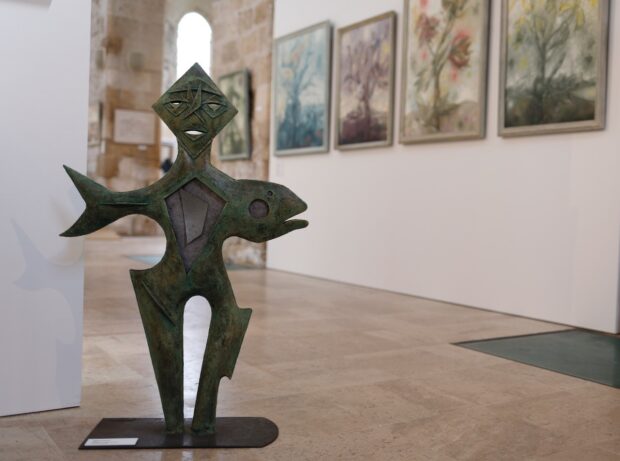 Au fil de l’exposition, nous ne pouvons que succomber au charme de la découverte d’œuvres simplement coloriées comme ce portrait inachevé sur papier, à des déclarations d’amour à Marguerite Toulouse, son épouse, dont une très jolie gouache, « Peggy » (1937) située à l’entrée de la collégiale. Place encore à une œuvre emplie de plénitude, cette poésie murale sur un texte de Pierre Reverdy, « Étoile filante » (1983).