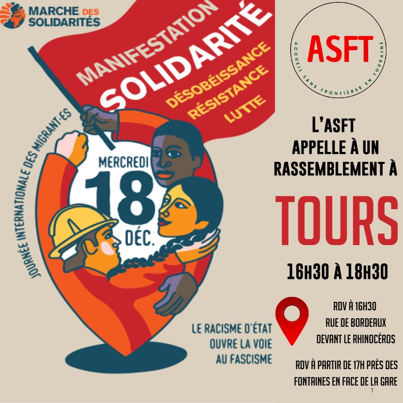 L’Accueil Sans Frontière de Tours (ASFT) appelle à un rassemblement le mercredi 18 décembre à Tours à l’occasion de la Journée Internationale des Migrant-es. Le rassemblement aura lieu à 16h30 rue de Bordeaux, devant le Rhinocéros, puis à 17h jusqu’à 18h30 en face de la gare de Tours, près des fontaines.