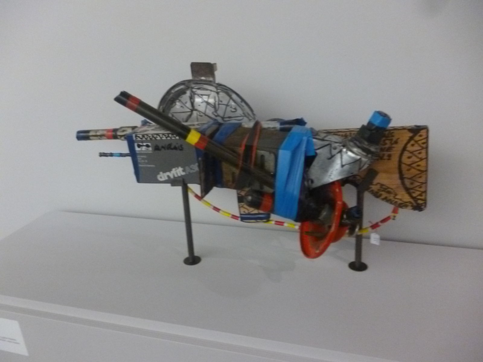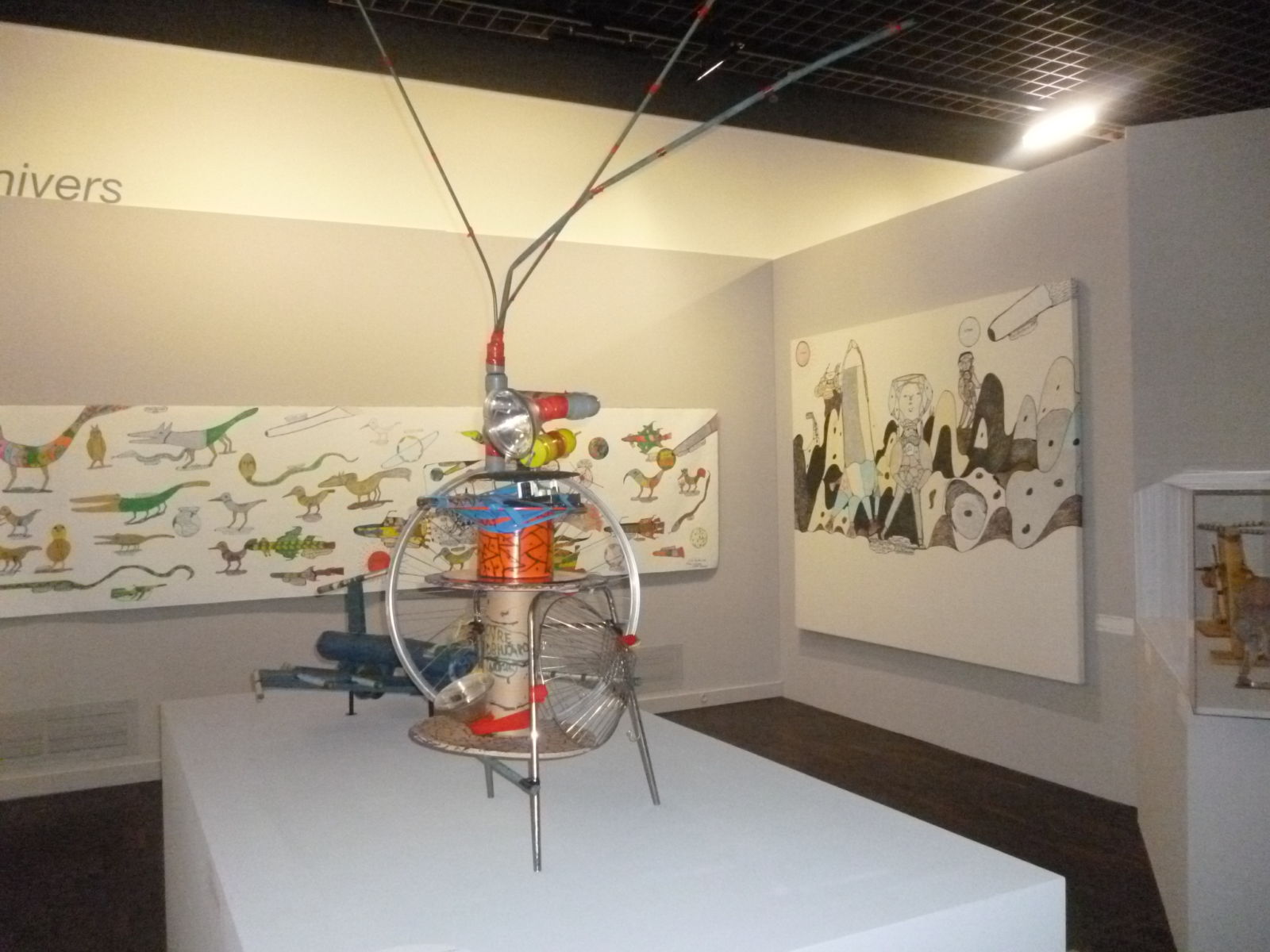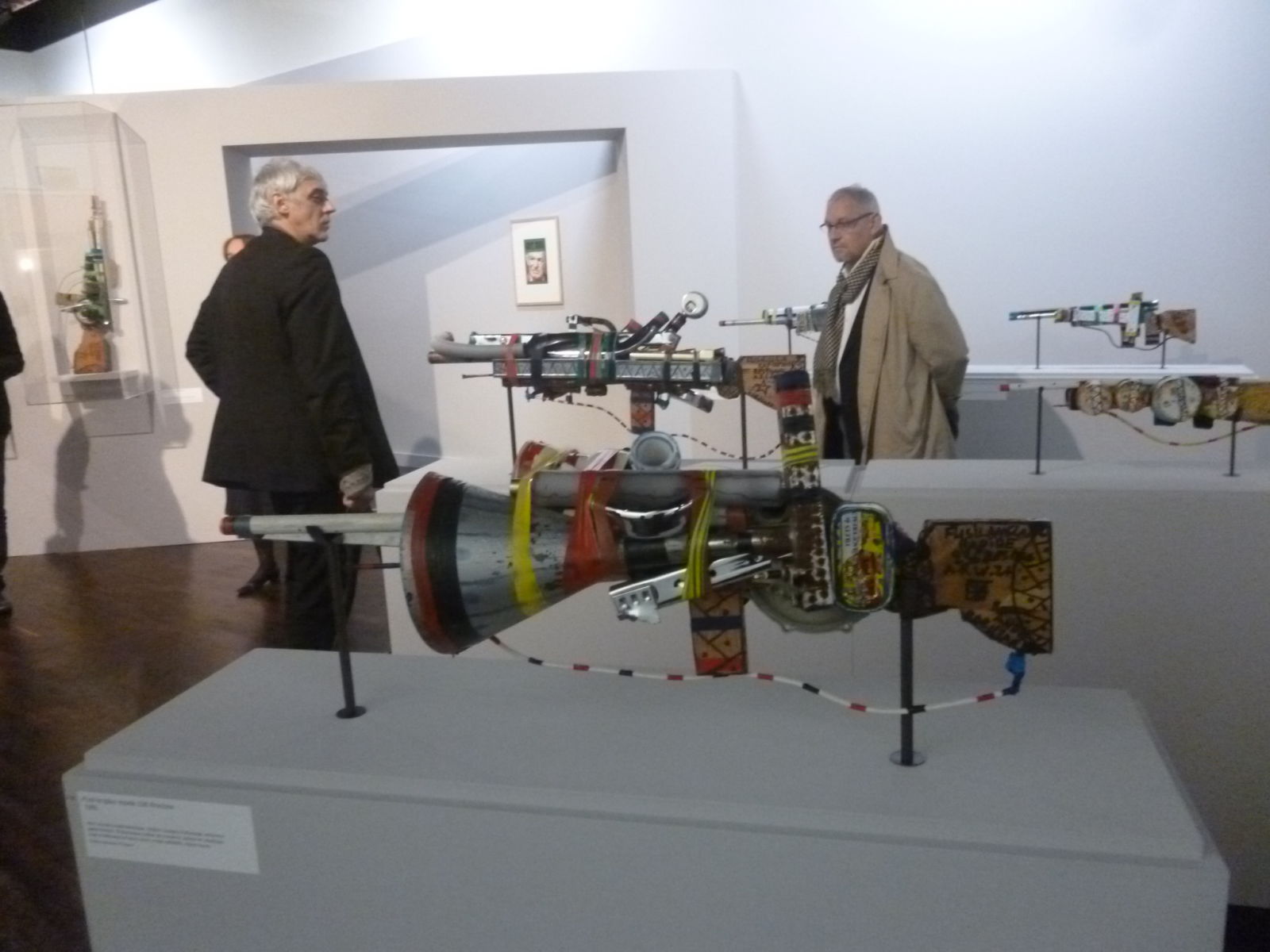 Aujourd’hui, issues de collections particulières mais aussi de celle du LAM ou du fonds de la Scène nationale d’Orléans, 100 œuvres de Robillard sont ici exposées. Voici certes les fusils pour « tuer la misère » et qui ont un jour attiré la décisive attention de Dubuffet, mais aussi des œuvres peintes évoquant un bestiaire personnel chatoyant et d’autres pièces évoquant la conquête et l’évolution spatiale.