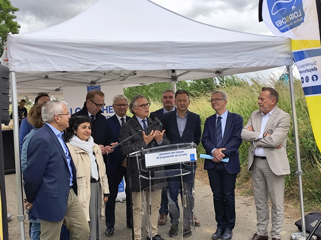 La future passerelle sur la Loire reliant La Chaussée-Saint-Victor, au nord, à Vineuil, au sud, verra le jour au printemps 2027. Les travaux de génie civil ont été lancés par l’ensemble des partenaires ce jeudi 5 juin sur la base de travaux mis en place par le groupement d’entreprises retenues (Bouygues travaux publics, Maeg et Colas). Il s’agit de la phase préparatoire de construction de l’estacade.