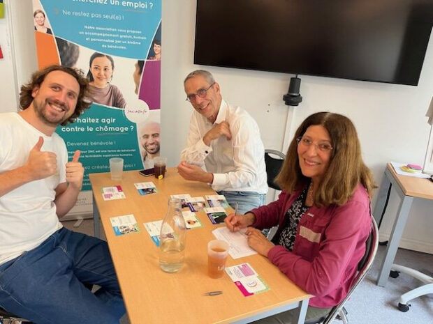 Après avoir découvert l’impact de la transition écologique sur l’évolution des secteurs d’activité et des métiers, les participants sont invités à participer à un jeu de rôle : ils doivent accompagner en binôme un personnage fictif (demandeur d’emploi ou salarié en reconversion) dans sa transition vers un emploi choisi, sain pour lui et pour la planète, sur le modèle d’accompagnement des chercheurs d’emploi mis en œuvre par l’association Solidarités nouvelles face au chômage (SNC).