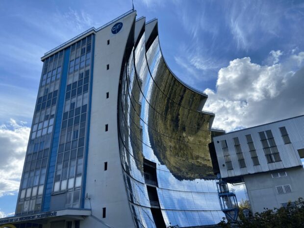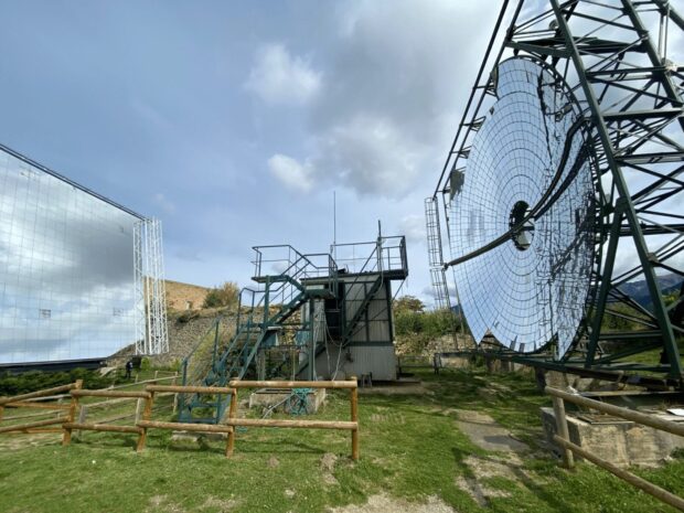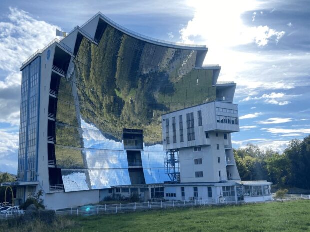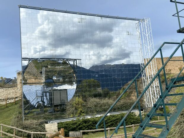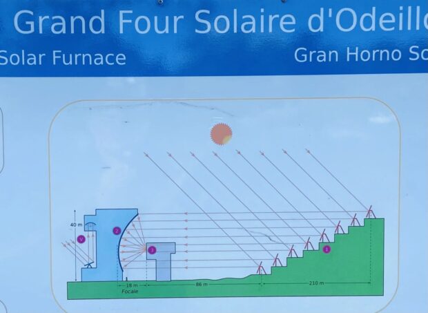 L’imposant concentrateur du rayonnement est aussi grand que l’Arc de Triomphe de Paris. Ici, l’héliostat est composé de 63 miroirs mobiles installés en demi-cercle sur une pente naturelle face au concentrateur. Le gigantisme permet d’obtenir au foyer des températures 3 800 °C. Le CNRS mène des recherches continues depuis son entrée en fonction en 1968 : résistance des matériaux, études sur les chaudières solaires, production d’hydrogènes, applications spatiales. Plusieurs laboratoires pas seulement universitaires cohabitent pour mener des programmes européens publics et privés. Aujourd’hui, avec 1000 kW thermiques, le four d’Odeillo-Via est le plus puissant au monde avec celui de Parkent en Ouzbékistan. Le site est actuellement fermé aux visiteurs. L’accueil est en cours de réaménagement même si les extérieurs restent accessibles.