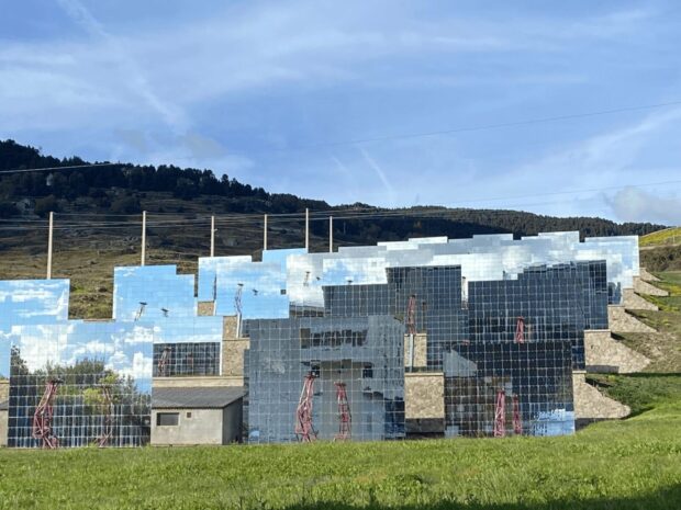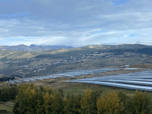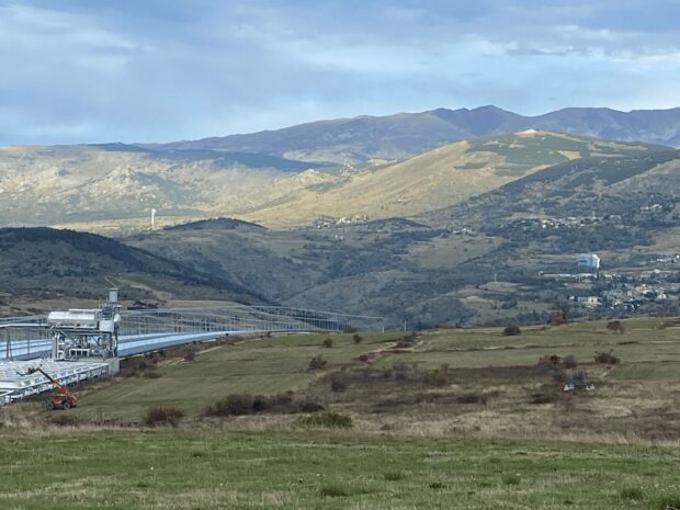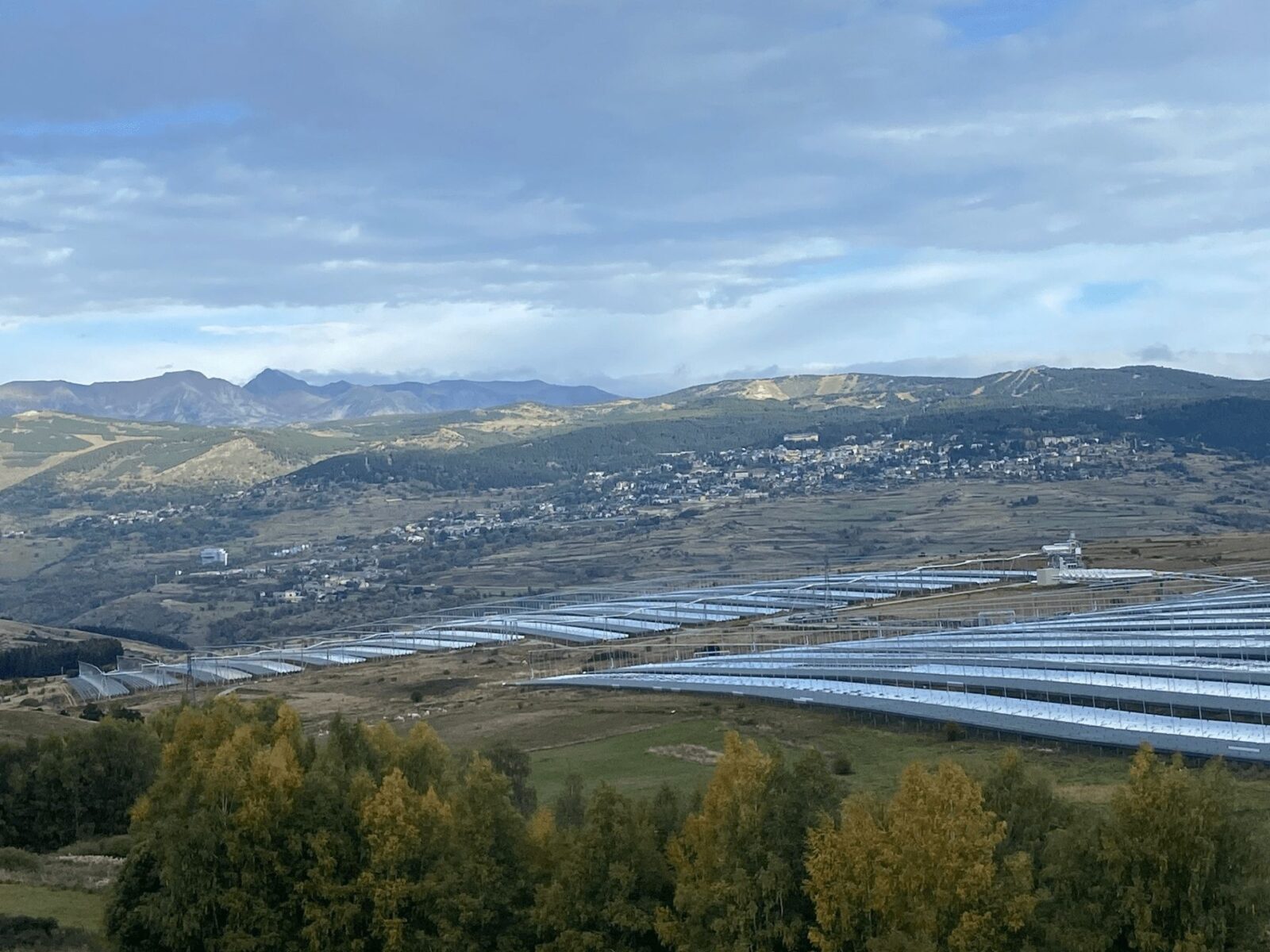 Créée en 2018, c’est la dernière-née des installations solaires dans le petit territoire cerdan. C’est aussi la seule en situation de produire de l’électricité raccordée au réseau. Dans la large vallée dominée par la tour de Thémis, sur la commune de Llo (prononcer Lio) connue pour ses bains d’eaux chaudes sulfurées en plein air, s’étalent d’est en ouest sur une pente douce les alignements de capteurs solaires. Ils occupent une surface de 36 ha (50 terrains de football !) Dans le cahier des charges du projet, ce système doit pouvoir produire selon les prospectus l’équivalent de la consommation électrique de 7 000 personnes, de jour comme de nuit. Car c’est bien dans cette particularité que l’installation est unique au monde.