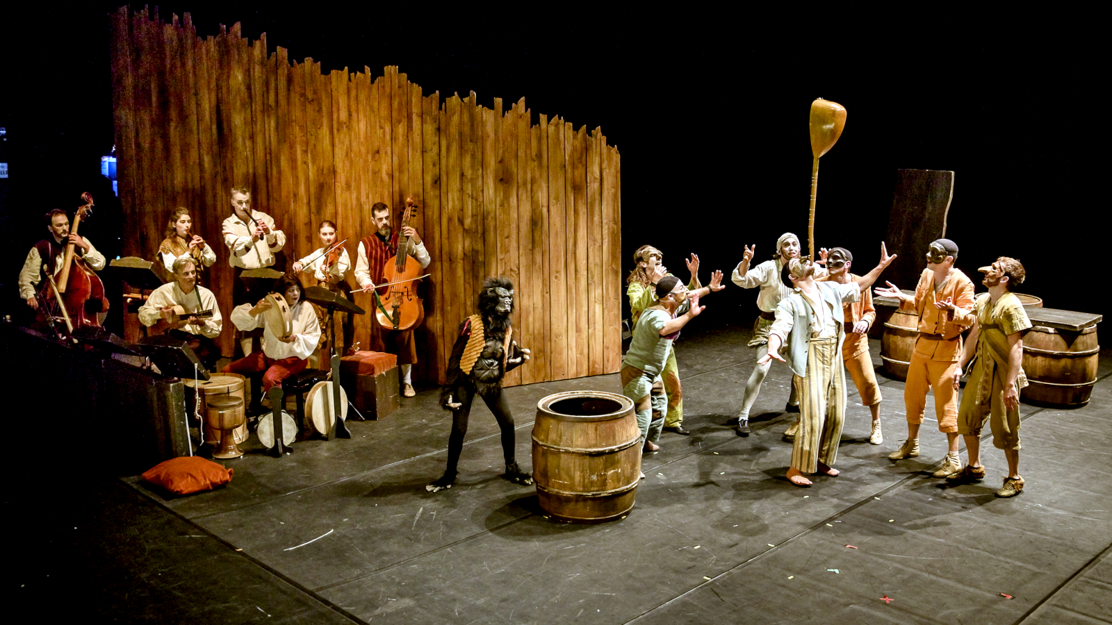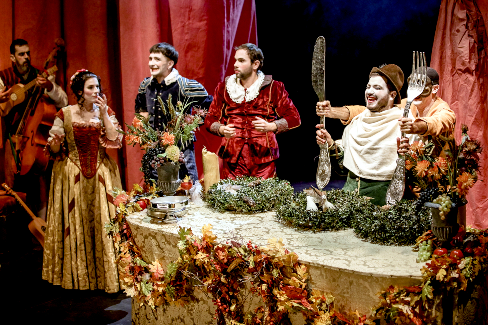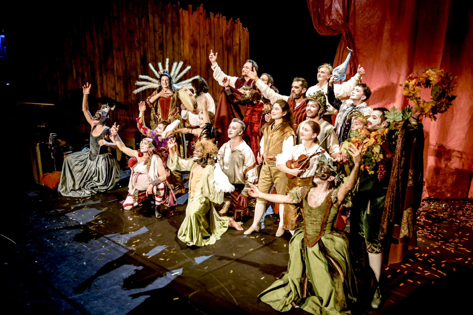 Côté jardin, sept musiciens jouent sans discontinuer et entraînent le spectateur dans l’univers des sonorités baroques du violon, cornet à bouquins, viole de gambe, théorbe, guitare, percussions… Côté cour, c’est un spectacle vivant à couper le souffle. Du banquet gargantuesque aux pantalonnades de la Comedia dell’arte, avec jongleurs, acrobates, magiciens et autres personnages des plus grotesques aux plus majestueux, tout est tourbillon, liesse et splendeur. Indescriptible.