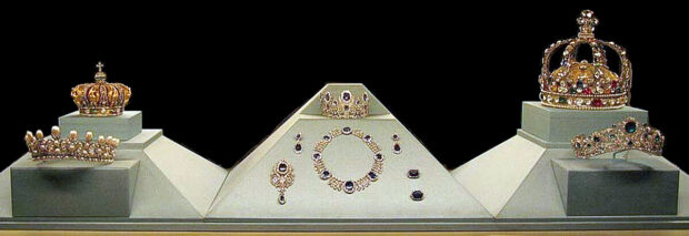 Joyaux de la Couronne de France, exposés au Louvre avec le diadème et la couronne de l’impératrice Eugénie à gauche, l’ensemble de la reine Marie-Amélie au centre et la couronne de Louis XV à droite avec le diadème de la duchesse d’Angoulême. Crédit Michael Reeve (Wikipédia)