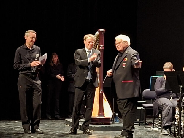 Au terme de ce concert dont on ne peut que saluer les remerciements adressés aux équipes techniques du théâtre ainsi que les heureuses introductions parlées afin de présenter au public les œuvres via quelques mots poétiques et savants, la MMO a rendu hommage à trois personnes. Le premier hommage est adressé à Gilles Guénin, trompettiste qui a reçu sur scène, des mains du maire de la cité, Serge Grouard, la médaille de la Musique municipale d’Orléans pour ses cinquante ans de présence au sein de la MMO. Le second a été adressé à Odette, mélomane centenaire absente ce dimanche. Le troisième a été adressé à Madeleine, mélomane et spectatrice née en 1925. Cette dernière n’a jamais manqué un concert de la MMO. Benoît Barberon, percussionniste et par ailleurs administrateur général de l’Orchestre symphonique d’Orléans, est ainsi venu lui offrir, dans la salle, sous les applaudissements du public, un joli bouquet de fleurs. Pour la remercier et, bien entendu, continuer de l’énamourer.