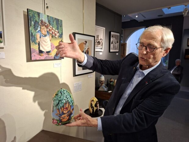Aux cimaises de cette exposition ludique, profonde, festive et poétique, figurent soixante-huit créations d’artistes contemporains qui ont bénévolement métamorphosé, avec malice et beauté, un modèle d’œuf en bois de hêtre plein façonné à la main par un ébéniste de notre région. Parallèlement à cette exposition d’œuvres qui feront l’objet dimanche d’une mise aux enchères (chaque pièce à partir de 140 euros), le Club Rotary Orléans a invité chaque artiste à exposer une de ses œuvres personnelles. Ainsi se trouvent présentés peintures, collages, sculptures, céramiques, créations numériques, bronzes. Ce passionnant ensemble est mis en place par Abel Moittié, commissaire d’une exposition riche de correspondances et de surprises à découvrir dans le bel écrin qu’est la galerie de Jean-Bernard Rouilly.