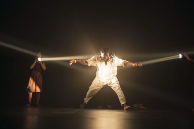 Et puis il y a la puissance et l’originalité des lumières. Elles aussi dansent. Venant souvent de la coulisse droite, elles découpent des tranches de zones visibles dans lesquelles les danseurs prennent une autre dimension. Généralement très fortes mais limitées, elles ciblent les corps comme pour mieux montrer les mouvements. L’ambiance pleine de fumée sur la scène dessine dans l’air les ombres des corps éclairés par ces lumières crues, les matérialisant pour les rendre visibles sur toute la largeur de la scène. Le découpage va jusqu’à un court moment stroboscopique pas forcément agréable pour les spectateurs. Mais l’effet est impressionnant. Et puis la lumière peut se faire aussi totalement dynamique. Des projecteurs tenus à la main jettent leurs traits de lumière qui semblent enchaîner un danseur dans leurs éclats. Il se débat mais les lumières, maniées de main de maître par six danseurs autour (qui eux sont invisibles car dans le noir), se dressent autour de lui comme des barreaux de prison.