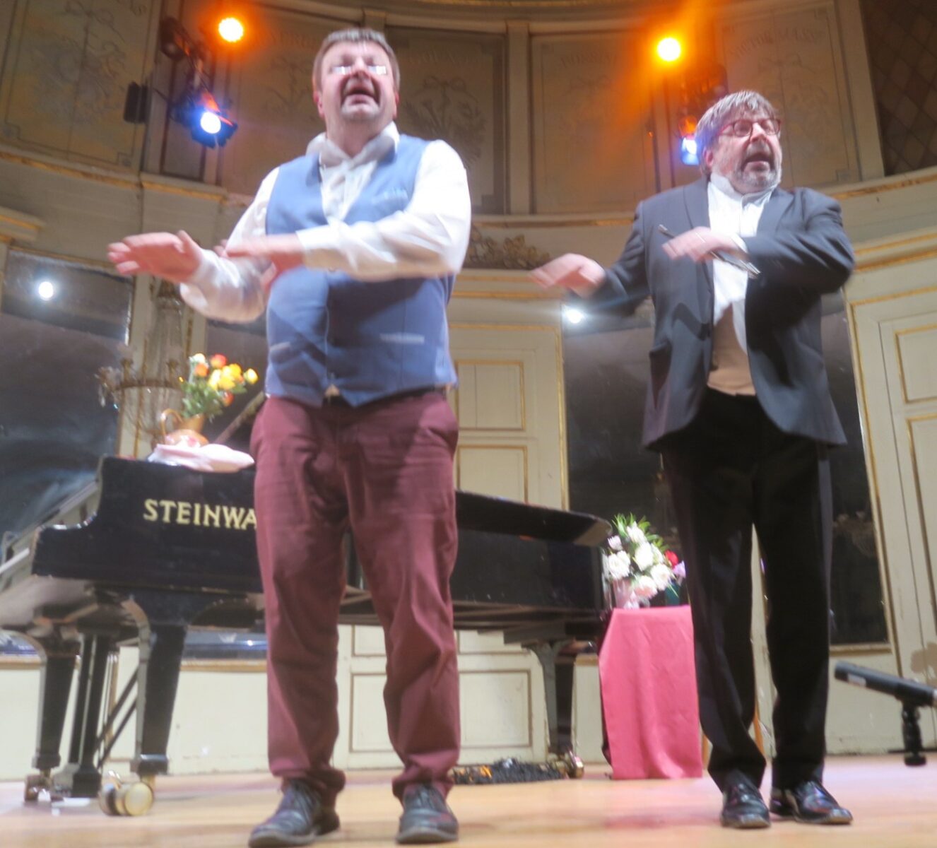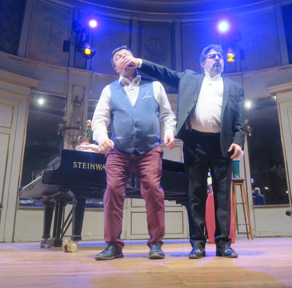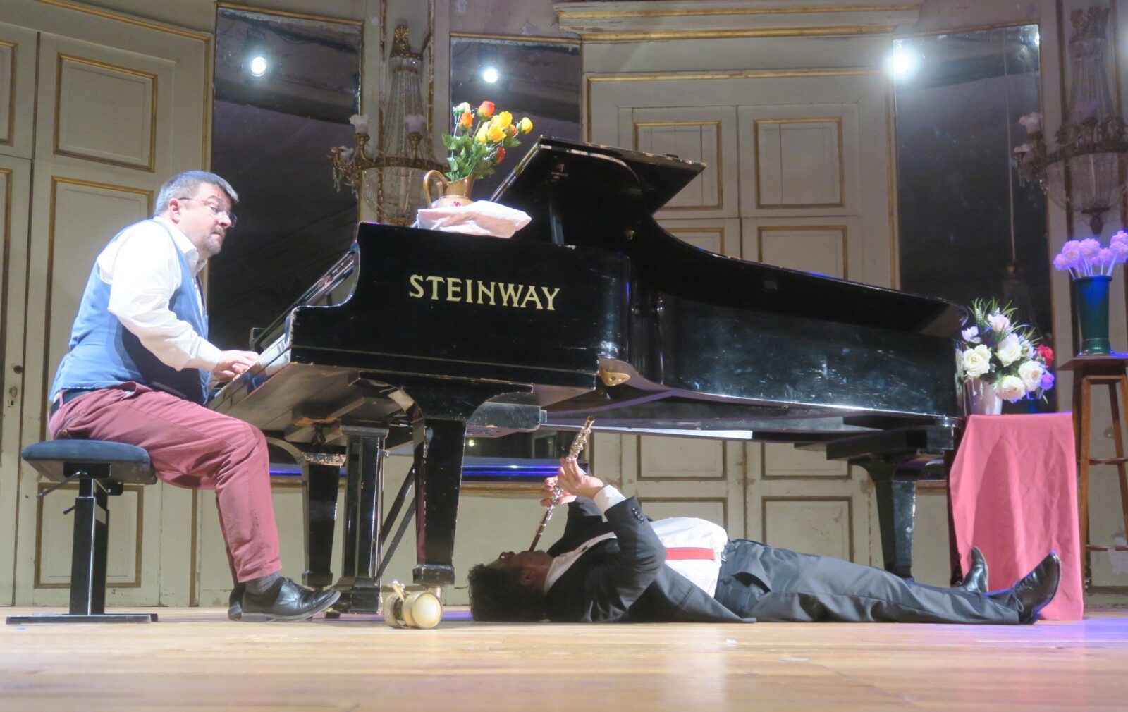 Clément joue à merveille de la flute ou du piccolo et dans toutes les positions, y compris couché sous le piano. Julien est au piano, mais lâche parfois la main gauche pour rythmer la musique au tambourin. Tous deux chantent, dialoguent, multiplient les facéties à la limite de l’impro, à l’aise sur scène comme avec la musique. Mention spéciale pour les variations de grande vélocité sur un thème de Carmen, ou l’air de la Reine de la nuit pour piano et sifflement !