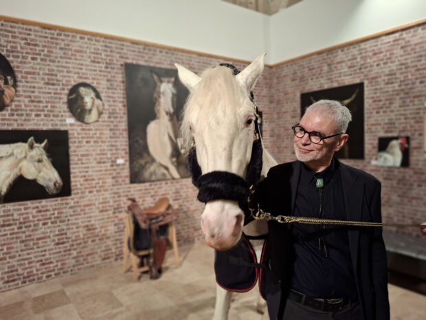 En effet, la belle idée des organisateurs a été d’inviter Jaïpur, étalon blanc de douze ans, modèle du peintre pour les huiles sur toile de lin « Pégase » et « Jaïpur », afin qu’il puisse lui aussi être mis à l’honneur. Accompagné gracieusement par des amis de l’artiste, Katia Croset et Fabien Couratin, responsables de la célèbre écurie d’Arcadie sise à Maray (Loir-et-Cher), Jaïpur, doux et paisible, n’a certes pas volé la vedette à Capton mais a fait naître à son tour plus d’un coup de cœur.