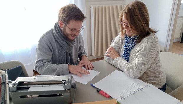 Aujourd’hui, c’est mercredi. Et comme chaque semaine depuis fin septembre, Marie-Laure Fuhrer a rendez-vous avec Valentin pour un de ses cours hebdomadaires. Déficient visuel, le jeune homme de 27 ans apprend le braille dans le cadre d’un projet professionnel, enseignement sans lequel, selon lui, son intégration serait compliquée. Alphabet, machine à écrire Perkins, plage braille électro-mécanique, bloc-note connecté… l’enseignante met à sa disposition différents outils. « Selon l’âge et les vécus, la motivation est différente et la durée d’apprentissage peut aller de 6 mois à 3-4 ans », explique Marie-Laure. « On ne peut pas dire que le braille soit difficile à apprendre. C’est un code, comme une langue des signes, qui demande de la mémoire. Un enfant qui naît aveugle rentrera dans le braille plus facilement qu’un adulte qui le devient : il y a une part de psychologie, certains ne veulent pas apprendre parce qu’ils sont dans le déni ».