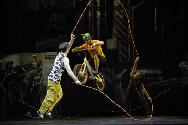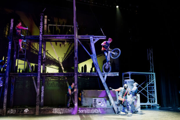 Mais avec des prouesses de cirque. Car la troupe est d’abord circassienne. Les numéros, comme on disait dans les cirques d’autrefois, sont ici intégrés dans un déroulement unifié par cette ambiance. Chaque spécialité y trouve sa place, et des intermèdes judicieux permettent l’ajustement du plateau pour passer de l’une à l’autre. On ne quitte jamais cette esthétique de la ville, de l’art de la rue.