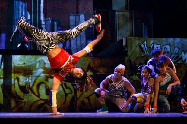 Le somptueux décor, mi-réel, mi-projeté, se révèle sous nos yeux. La ville, style New York, la ville verticale, la ville complexe, sonore, rythmée. Toute la troupe commence par s’y installer, s’y promener, pour que le spectacle ait un lieu qui détermine l’histoire. Dans cet environnement urbain, des groupes de jeunes se défient avec des gestes, des attitudes de breakdance, et nous font rentrer par leur chorégraphie énergique dans une comédie musicale sans parole.