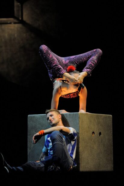 Alors il y a le mât chinois autour duquel une étrange danse collective se déroule pour soutenir l’athlète qui réalise ses acrobaties. Il y a une contorsionniste qui apparaît plusieurs fois, dans des moments d’échanges vigoureux ou plus romantiques avec des partenaires. Il y a la fille au cerceau, nouveau trapèze, qui virevolte dans les airs. Il y a la roue Cyr, que l’on a déjà vue dans d’autres cirques, mais là, elle est éclairante et entourée de tout le reste de la troupe. Il y a un jongleur, pris dans les constructeurs de la ville, qui s’amuse à exercer son art sur des vitres. Ce qui donne une dimension supplémentaire à son agilité avec un humour plus efficace que certains clowns.