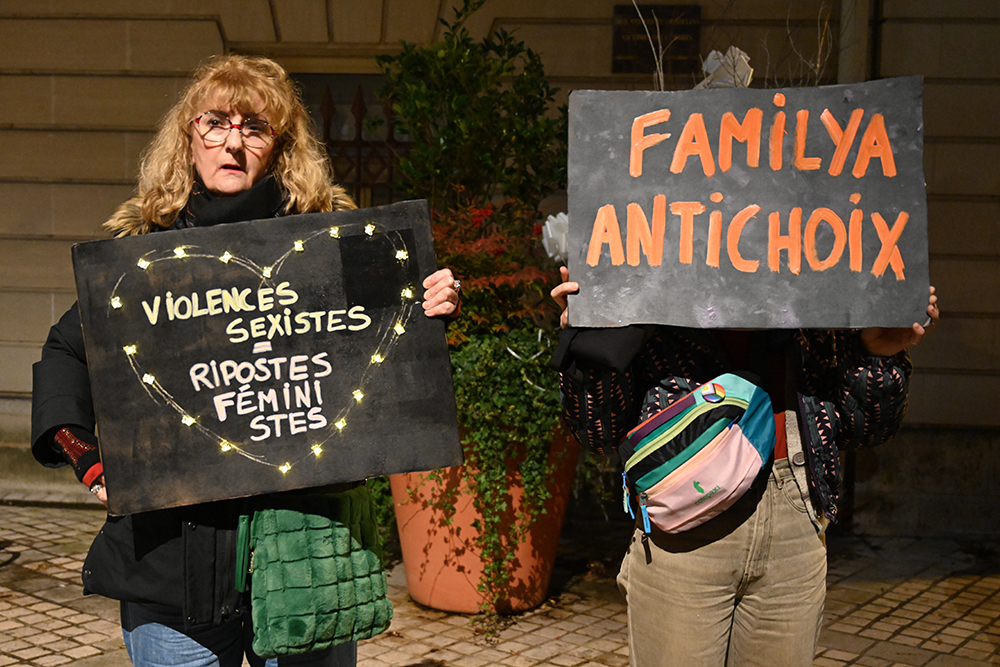 Des pancartes « Violences sexistes = Ripostes féministes » et « Familya Antichoix » pour protester contre le partenariat entre le CCAS et Familya. Photo : Jean-Luc Bouland.