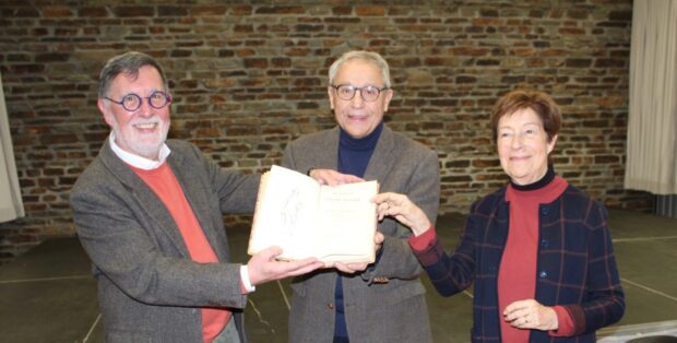 Thierry Dréano remet l’exemplaire original de 1853 à François Daugeron, maire de Sainte-Sévère et Michèle Luneau-Pigois, présidente des « Amis de la Tour ». Photo PB