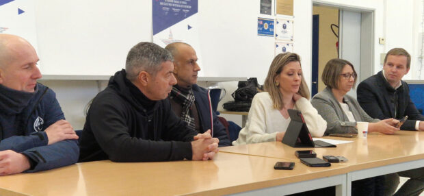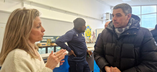 Élodie Naghmouchi présente la bande-annonce du match caritatif à Benoît Digeon, maire de Montargis, et à des sportifs mobilisés autour de sa cause – photo Izabel Tognarelli