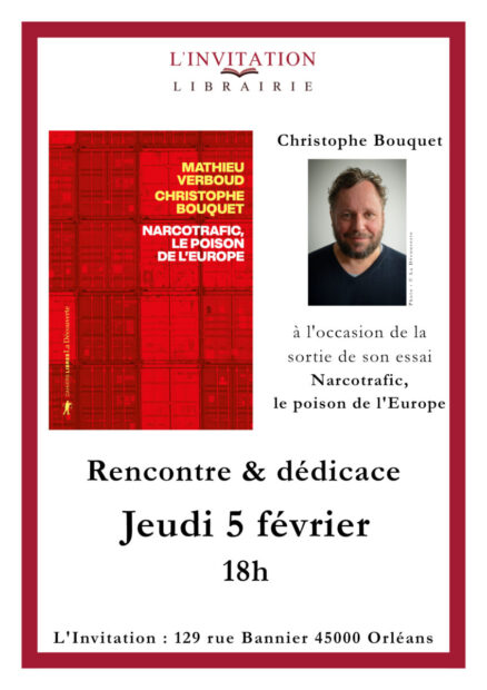 Deux rencontres bien différentes s’annoncent à L’Invitation début février. Jeudi 5 à 18h, il sera question du narcotrafic, avec ses racines et ses tentacules, dont viendra parler Christophe Bouquet, auteur avec Mathieu Verboud de « Narcotrafic, le poison de l’Europe » (éditions La Découverte).