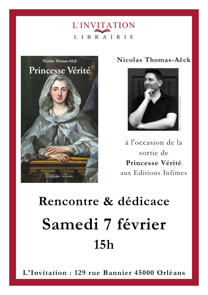 Samedi 7 février à 15h, c’est un tout autre sujet qu’abordera Nicolas Thomas-Aëck avec « Princesse Vérité » (édition Infimes). Dans ce premier ouvrage, l’auteur brosse le portrait de la princesse Bathilde d’Orléans (1750-1822), mère du duc d’Enghien, dévoilant un personnage méconnu, féministe avant l’heure, qui fréquentait les plus hautes sphères du siècle des Lumières avant d’être bannie et exilée.