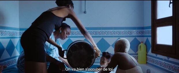L’arrivée d’une petite fille, tombée d’un bateau et recueillie par les trois femmes, commence l’histoire. Pour des raisons financières, son film ayant un budget réduit, la réalisatrice Erige Sehiri a été obligée de tourner beaucoup sans décors, à l’intérieur d’un gynécée où vivent les trois personnages et où se déroulent les rencontres religieuses. Mais en plus du peu d’argent, le film est tourné juste après la crise de 2023, quand le Président Kaïs Saïed fait des déclarations anti-immigrants dans un climat déjà assez lourd pour les Subsahariens vivant en Tunisie. Filmer dans la rue n’était donc pas vraiment possible. Quelques scènes quand même, notamment une bagarre d’enfants, Noirs contre Tunisiens, qui se disputent des bouteilles en plastique. La misère est de tous les côtés…