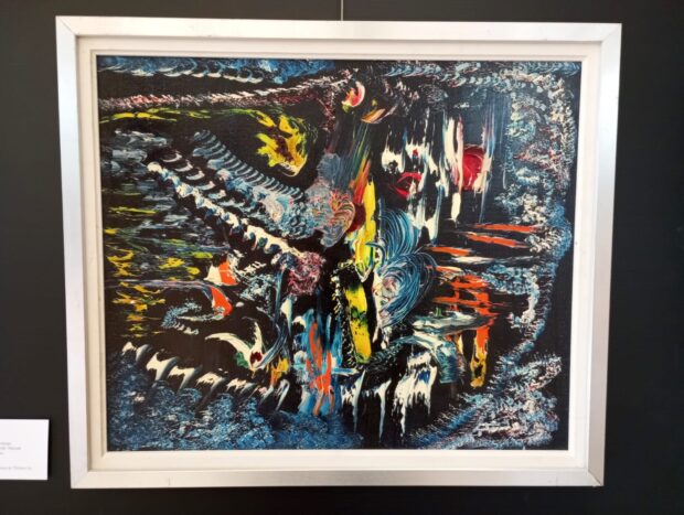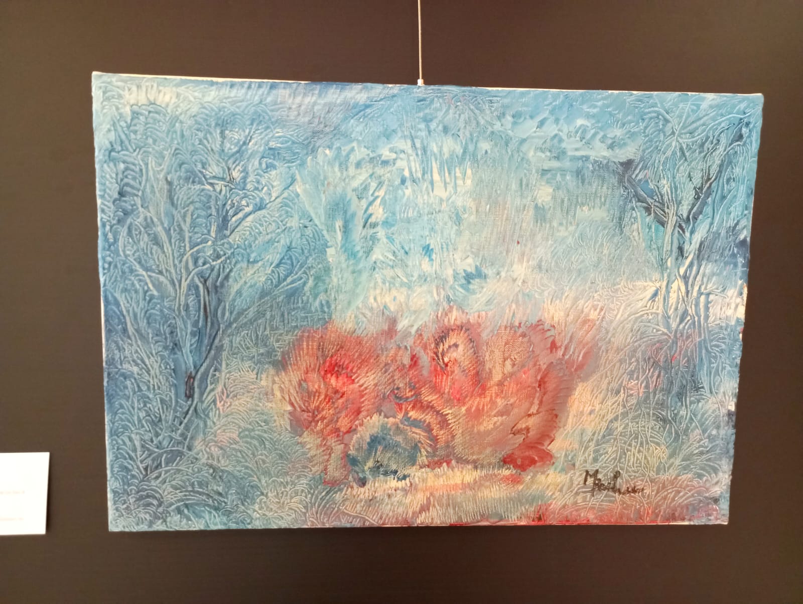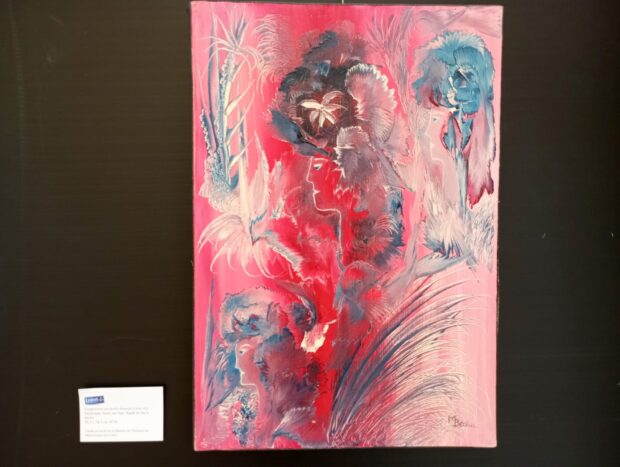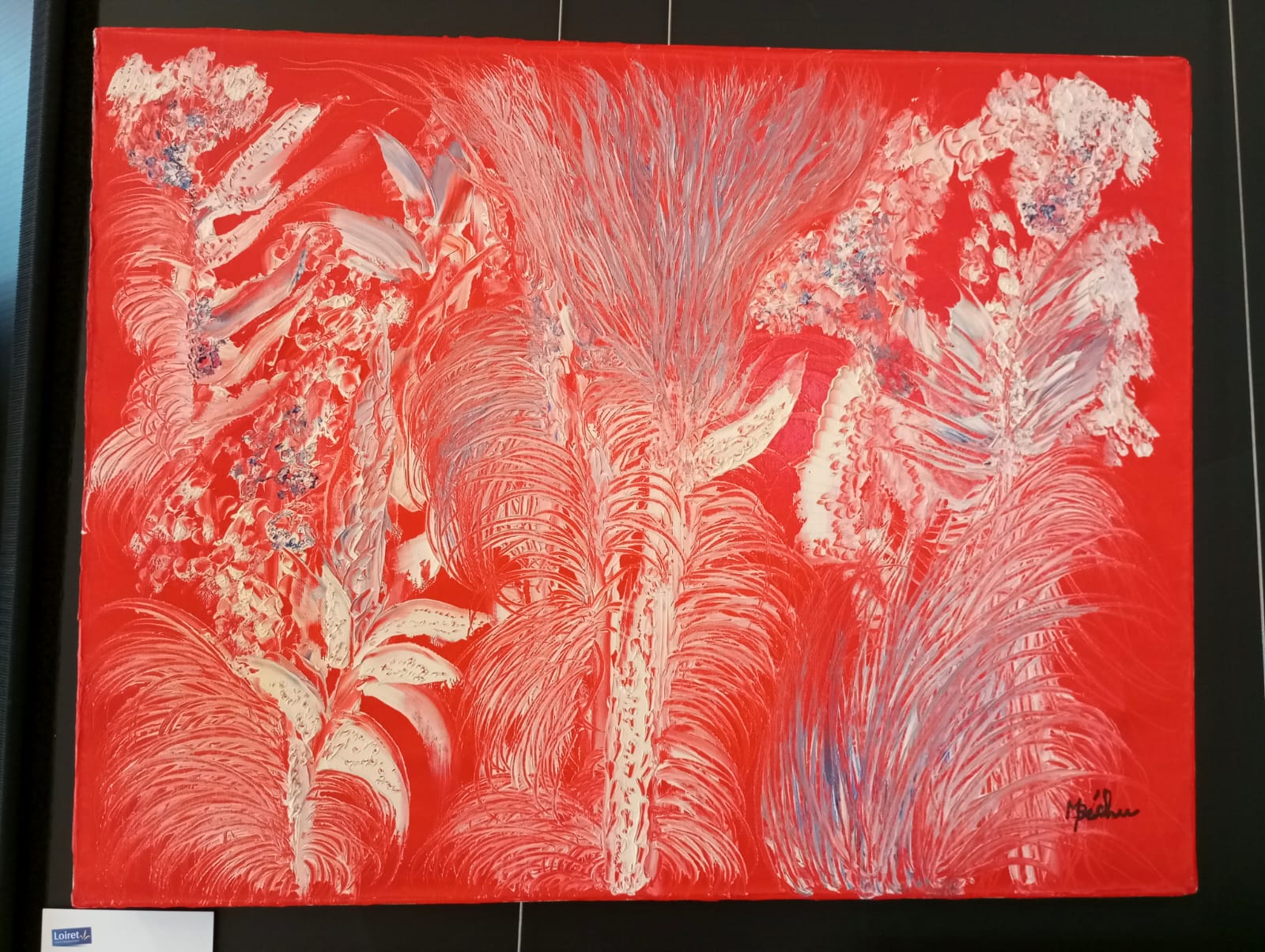 Composition à flore blanche et fond rouge, technique mixte sur toile, par Mireille Béchu. Photo : CG.