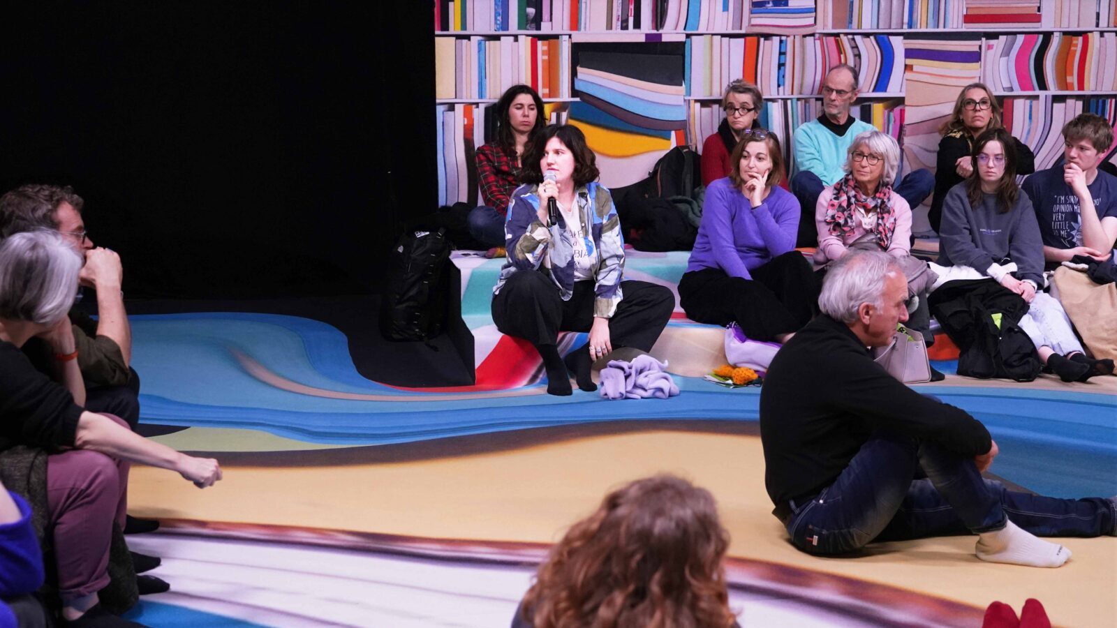 Avant d’entrer dans l’Antre, le public est invité à se déchausser : un geste simple qui marque d’emblée le début d’une expérience inédite. En chaussettes, le⸱a spectateur⸱ice découvre un espace multicolore, presque enfantin, où l’imaginaire l’emporte sur les conventions théâtrales. Conçue comme « une bibliothèque fictionnelle, un abri pour séjourner avec les autres et tendre l’oreille collectivement », l’Antre se présente moins comme un décor que comme un lieu à habiter.