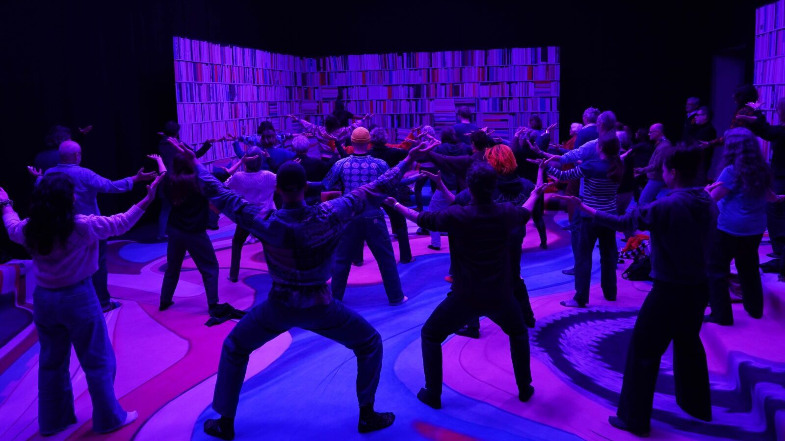 Inspirée de la bibliothèque Joanina au Portugal, elle prend la forme d’un « habitat-bibliothèque chimérique » : les livres composent un jardin coloré où l’on peut s’asseoir, s’allonger, circuler librement. En brouillant les frontières entre scène et salle, acteur⸱ices et spectateur⸱ices, le dispositif scénique ouvre un espace partagé, propice à l’expérimentation. C’est dans ce cadre qu’Archive Fever élabore une performance fondée sur l’implication active du public.