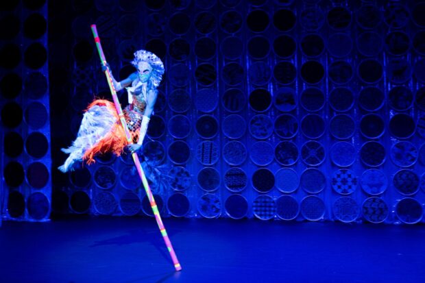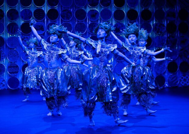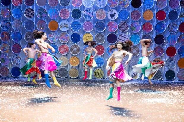 On avait beaucoup aimé Dragons, que Eun-Me Ahn avait présenté l’année dernière. Ce nouveau spectacle, Post Orientalist Express, continue son travail. Une sorte d’exploration inventive de la culture asiatique, sans vraiment de références précises. Peut-être y en a-t-il pour elle, mais le public occidental aura du mal à les identifier. On reconnaît des gestes de danse, indiens ou du sud-est asiatique, on reconnaît des silhouettes khmers ou japonaises. Et il y a tout un bestiaire sorti des histoires religieuses ou non (des monstres, des formes indéfinissables) ou sorti du folklore (singes, pandas). Mais surtout il y a l’esthétique colorée que la chorégraphe adore et qui traduit ses origines coréennes. Une myriade de costumes, tous plus éblouissants les uns que les autres, et un décor impressionnant en fond de scène, des ronds décorés qui s’animent, se colorent, semblent vivre chacun leur propre vie, construisent un spectacle qui en met plein les yeux.