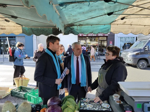 Le rendez-vous était donné à 10h30 sur le marché des Halles pour les soutiens de Christophe Bouchet. À cette heure-là devait commencer la séance publique de la venue de Gabriel Attal aux côtés de Christophe Bouchet. Au lieu d’un temps solennel de réunion publique, le choix s’était porté sur un temps public. La venue de Gabriel Attal venait apporter la caution centriste de la liste d’union de la droite et du centre affirmée par Christophe Bouchet. « Nous avons deux jambes, c’est ce qui nous permet d’avancer », justifiera-t-il lors des questions de journalistes sur l’écart entre l’accueil de Bruno Retailleau en début d’année et celui du jour.