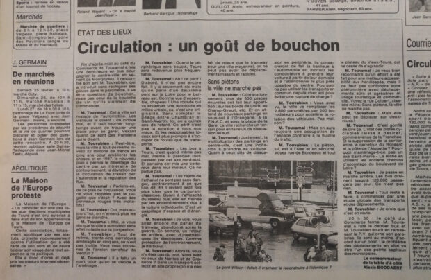 Mais c’est surtout lors de la campagne 1977 qu’apparaît pour la première fois la question politique des pollutions, de la « ville asphyxiée » et de la nécessité de réorganiser la circulation autour de la marche et du vélo, reportant la voiture en périphérie. La rue Nationale continue d’être un enjeu majeur, les tensions voitures-piéton explosent et un long article de la NR couvre le… déplacement d’un passage piéton rue Nationale, témoignages à l’appui.